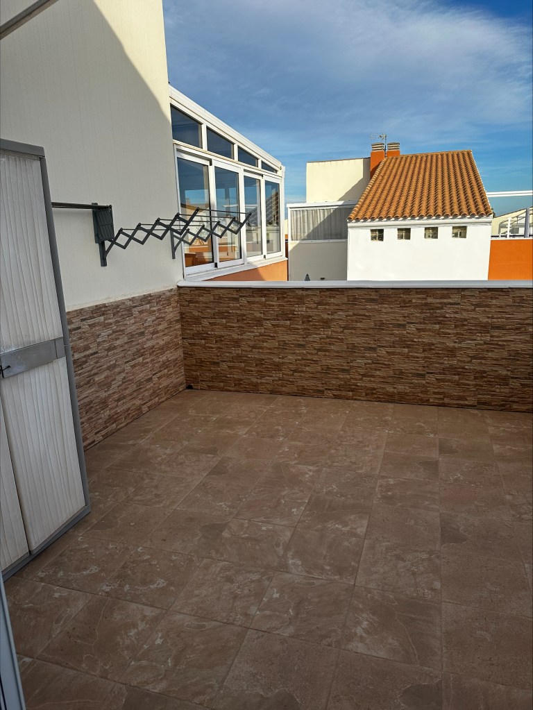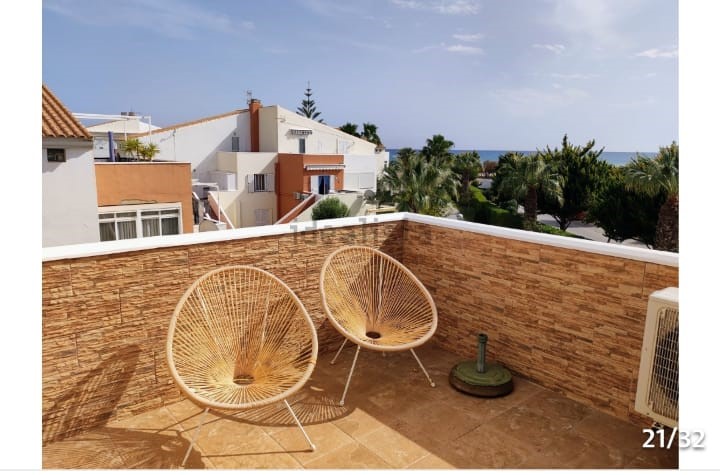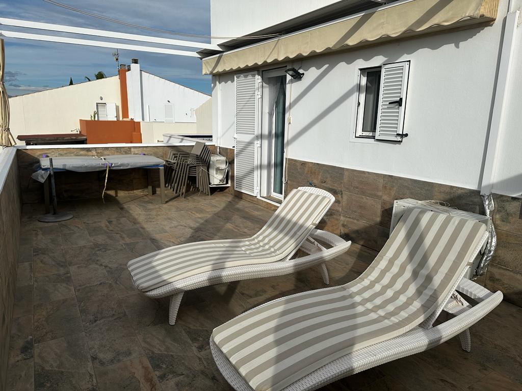 On the upper floor, you will find the bathroom, two large double bedrooms, and two beautiful terraces. One of these is particularly large, featuring a dining table and comfortable sun loungers for perfect moments of relaxation. All rooms are equipped with air conditioning, and the apartment also has its own covered parking space.