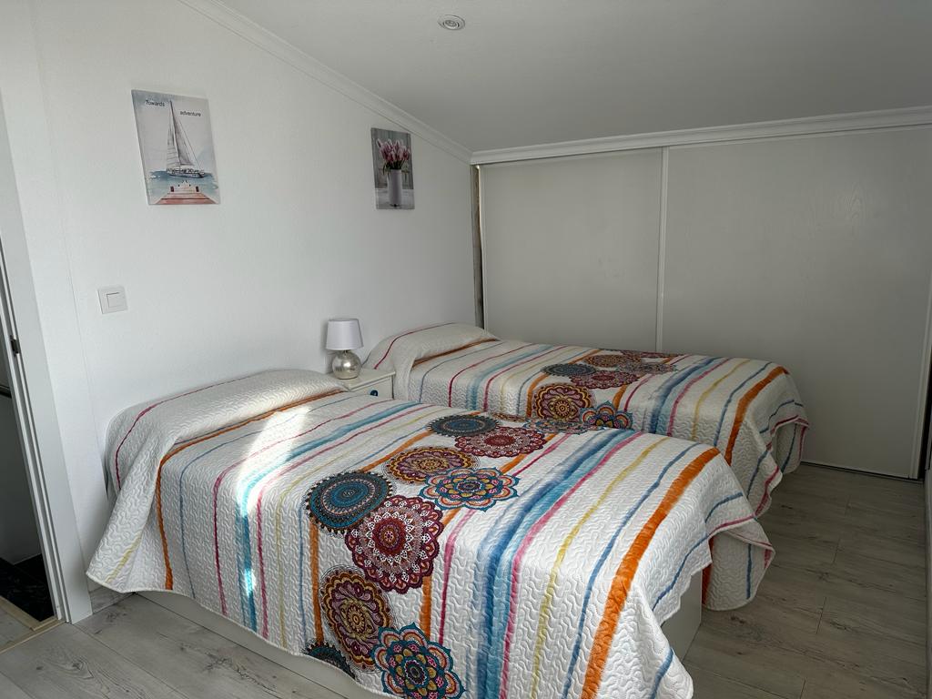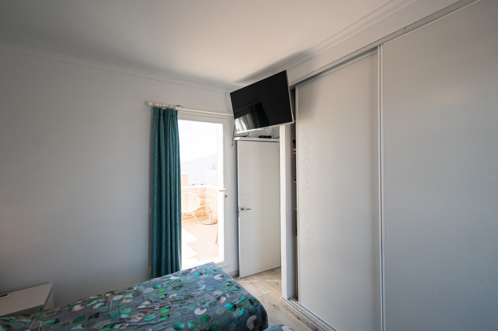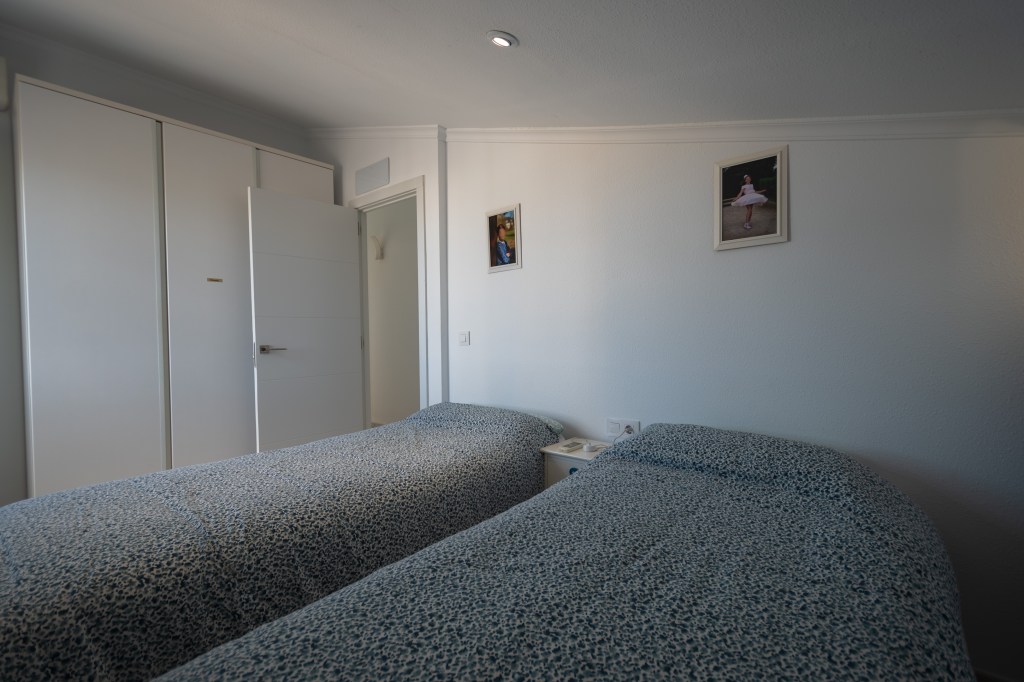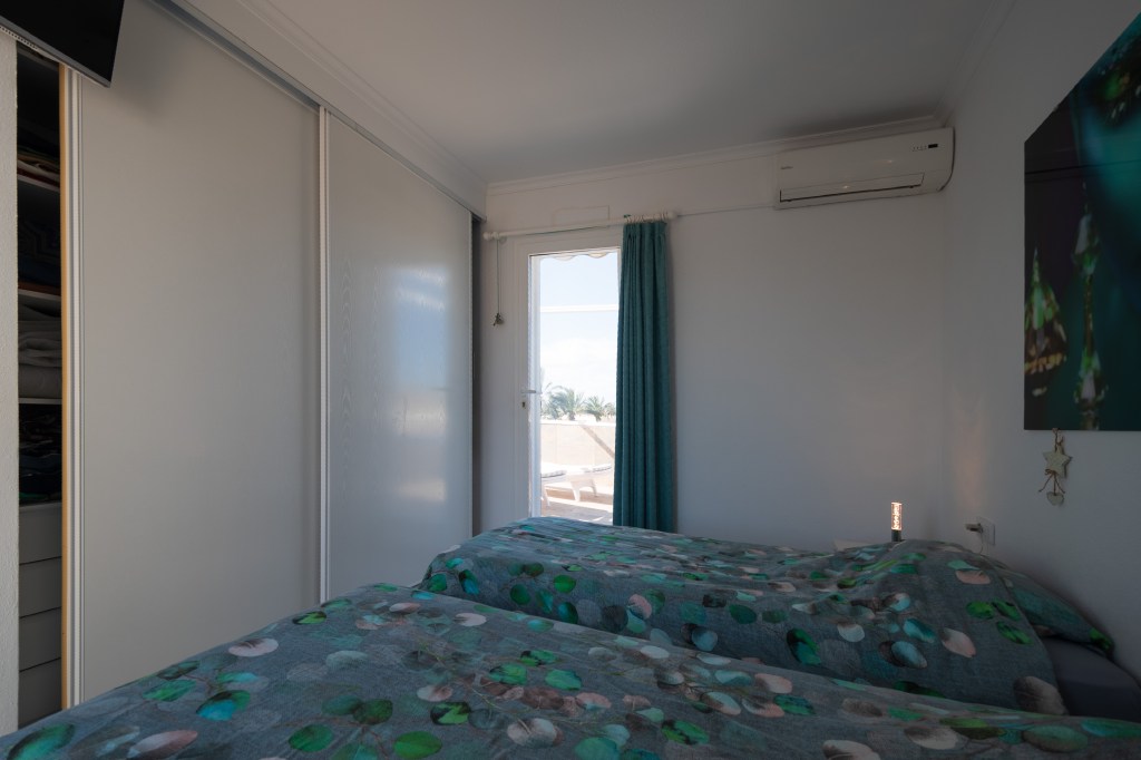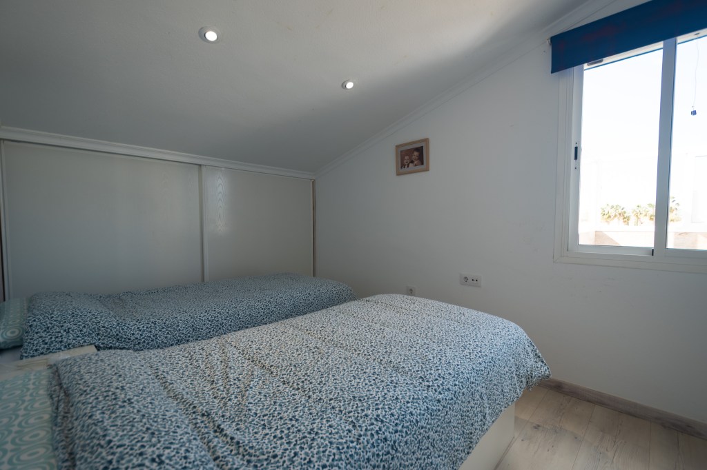À l’étage supérieur se trouvent la salle de bains, deux grandes chambres doubles et deux superbes terrasses. L’une d’elles est particulièrement grande et comprend une table à manger ainsi que des chaises longues confortables pour des moments de détente parfaits. Toutes les pièces sont climatisées et l’appartement dispose également de sa propre place de parking couverte.