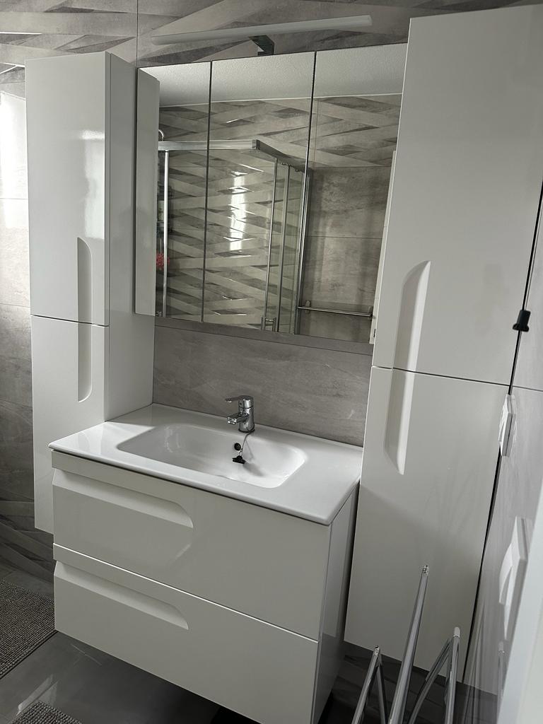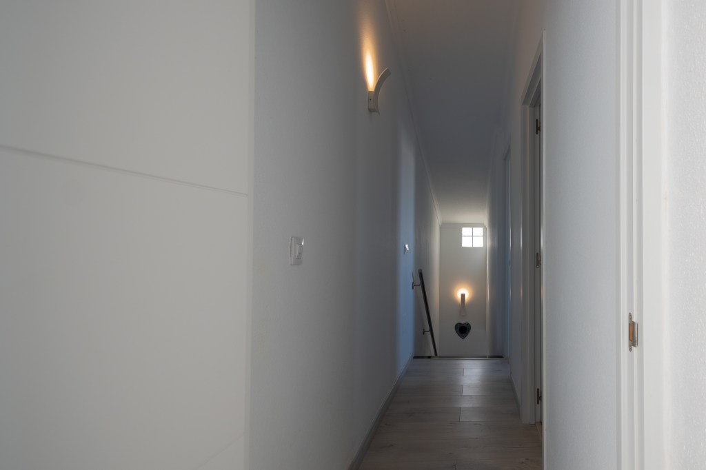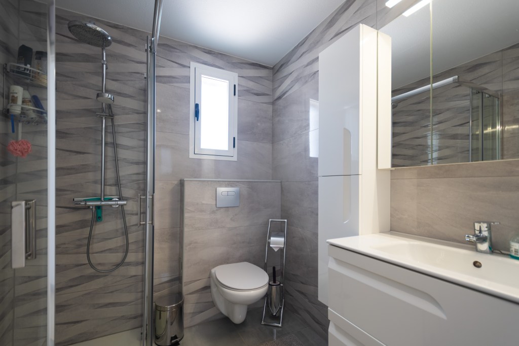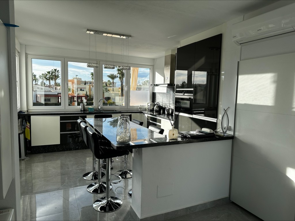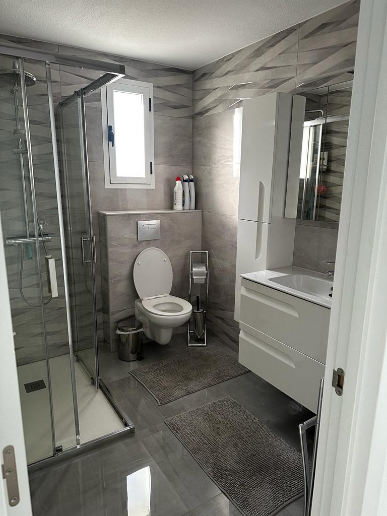 À l’étage supérieur se trouvent la salle de bains, deux grandes chambres doubles et deux superbes terrasses. L’une d’elles est particulièrement grande et comprend une table à manger ainsi que des chaises longues confortables pour des moments de détente parfaits. Toutes les pièces sont climatisées et l’appartement dispose également de sa propre place de parking couverte.