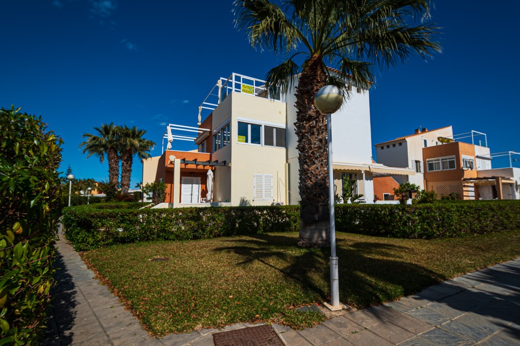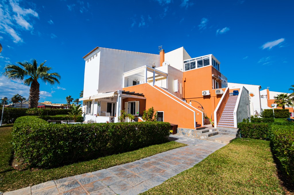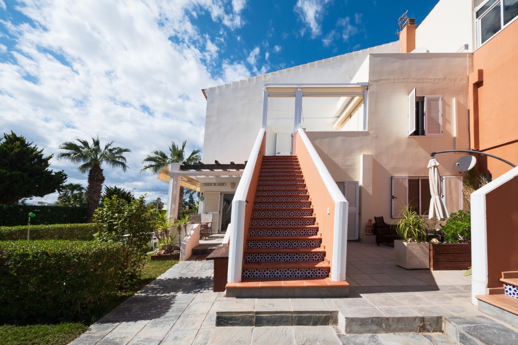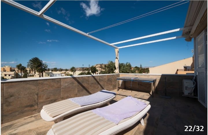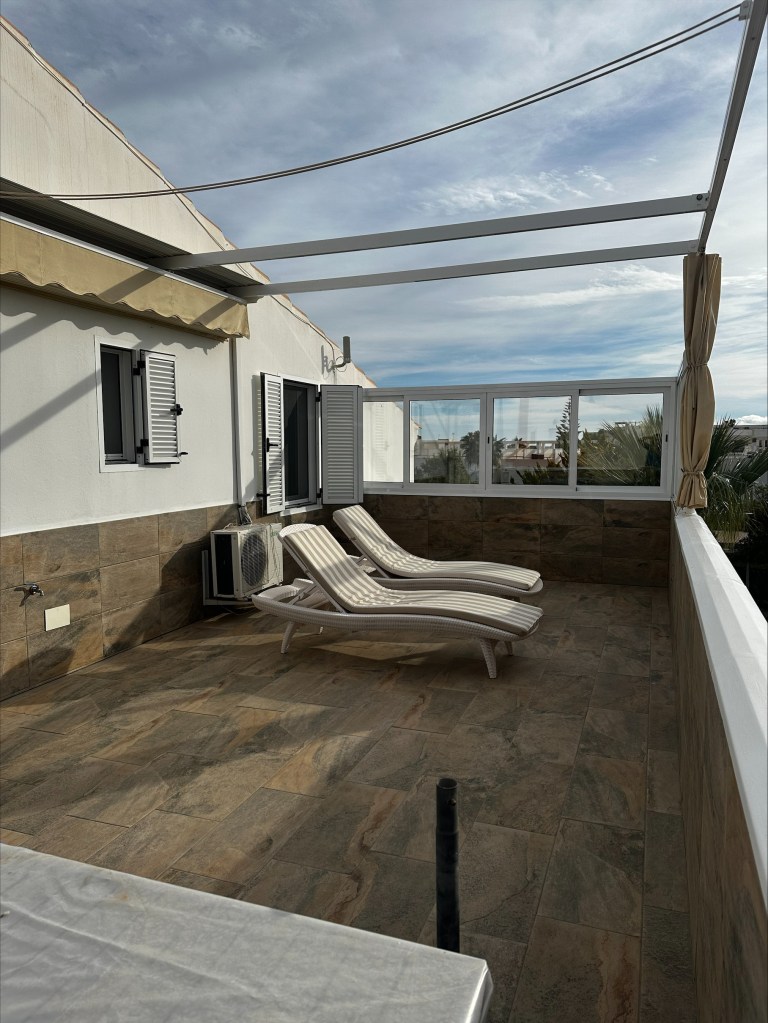 Im Obergeschoss befinden sich das Badezimmer, zwei große Doppelzimmer und zwei wunderschöne Terrassen. Eine davon ist besonders groß und mit einem Esstisch sowie bequemen Sonnenliegen für perfekte Entspannungsmomente ausgestattet. Alle Räume sind klimatisiert, zudem verfügt das Apartment über einen eigenen überdachten Parkplatz.